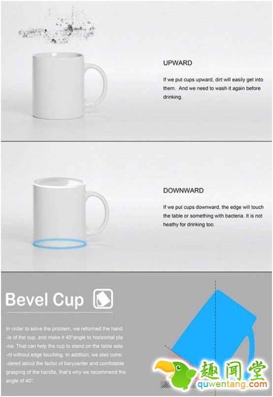 BevelCup,解决了杯子的摆放存在的问题,即杯口向上灰尘会进入杯子、倒扣着杯子杯口直接接触桌面。灵感来源于芭蕾舞演员角度的锥杯,利用把手上的一个面的角度使得杯子既不会向上接灰尘也不会朝下接触到任何让你不放心的东西。