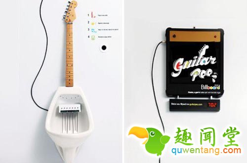 巴西Billboard Music Brasil 公司带来了一个有趣的项目:电吉他小便池。小便池内安装了感应琴弦及压力感应器,当你对着它嘘嘘的时候,压力感应器会根据你尿的强弱而拨动琴弦,创作出各种声调与旋律的摇滚音乐。