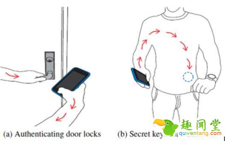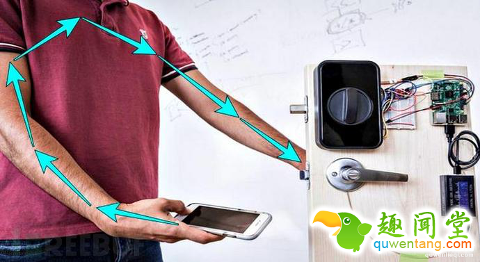 当然,这项设计乍听起来确实有些不可思议,但工程师们解释了其基本工作原理,事实证明这听起来相当靠谱?;⒍俅笱У缙こ滩┦可鶰erhdad Hessar说,这好比我们使用一把电子智能锁来开门。在实验中我们会使用到两个设备,即 iPhone和电子锁,很明显,iPhone负责对用户的密码细节信息进行存储。这条密码能够以用户指纹的形式完成保存。我们假定这把电子门锁需要用户的指纹信息才能开启。从传统角度讲,大家应该会直接在锁上安装一套指纹传感器,用于在手指贴近后进行指纹识别。接下来,这部分数据会以信号的形式通过无线网络进行传输,最终被电子门锁所接收并处理。然而,这种方法的缺陷在于,恶意人士有可能截获这一重要传输信号。而现在我只需一只手触摸门把手,然后另一只手触摸手机上的指纹传感器,然后就把我的授权信息通过我的身体传输给了门锁,然后就可以开门,在这个过程中不会泄露我的个人信息。