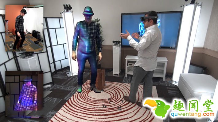 这项技术需要配合微软的增强现实眼镜 HoloLens 使用,戴上 HoloLens 后,你就可以看见他(虚拟的人)并且和他互动了,就像你们真的在一起一样。