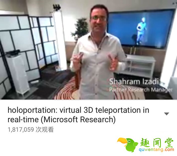 最开始动图的出处,就是微软研究院不久前在油管上发布的一段视频,里面向全世界展示了他们潜心狂点科技树的结果:推出了一种叫全息通讯(Holoportation)的实时虚拟 3D 传送技术!