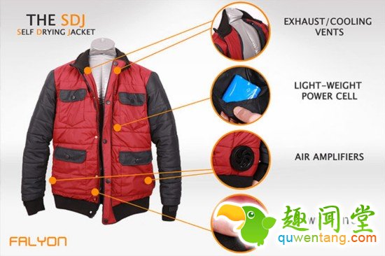 据悉,该夹克仅重4盎司(约113克),表层为防水尼龙材料,外层为涤纶制成的合成绝缘材料。而其奇特之处就在于,其内置的高压空气循环系统能让衣服在1-2分钟内速干。