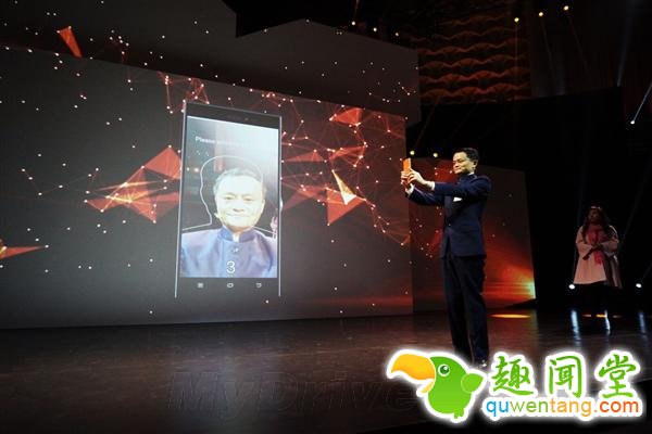 马云在台上直接演示了支付宝的人脸支付功能,同时还把手机上的实时画面传输到大屏幕上,因此也就有了下图中这张罕见的自拍照。