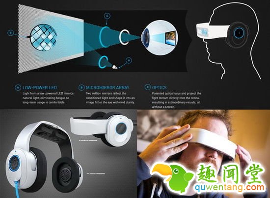 美国埃夫根特公司(Avegant)出品的 Glyph 是一款虚拟现实的三维眼镜,但它的工作原理非常特别,是通过把影像的光线投射在人眼上,然后在视网膜上成像。该公司将这技术称为“虚拟视网膜屏幕”(VRD)。使用VRD技术,人眼直接接受入射光线,因而该设备的视觉体验与普通屏幕全然不同,更像是透一扇窗看外面的景色,会非常真实。