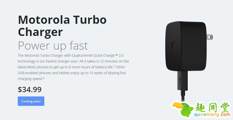 摩托罗拉已经悄然提出了一款能够在15分钟内,为设备充满8小时续航所需能量的新款充电配件,它就是采用了高通Quick Charge 2.0技术的Turbo Charger。当然,想要获得这一“魔鬼般”的充电速度,设备的电池需要处于基本耗尽的状态,因为Turbo Charger的充电速度会在后段变得越来越慢。