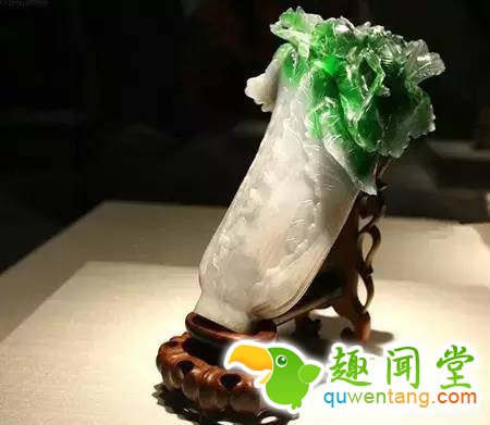 现藏于台北故宫博物院。是用一半灰白、一半翠绿的玉石雕成,雕刻师把绿色的部位雕成莱叶,白色的雕成菜帮,菜叶自然反卷,筋脉分明,上面还攀爬两只红色小息的螽斯虫,遗憾的是螽斯虫左边一根须,断了一小节。