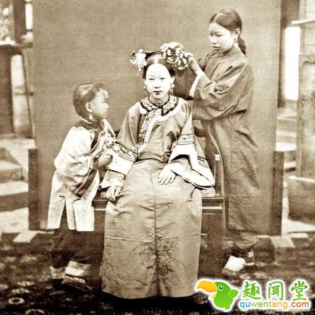 百年前晚清女子的真实形象:图为晚清一个大户人家的太太,丫鬟正在帮太太梳头,一小孩站在旁边好奇的看着。