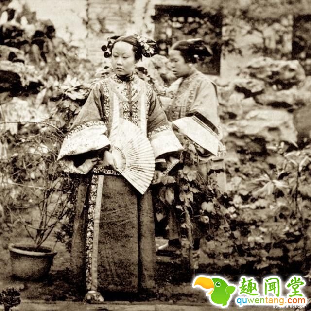 百年前晚清女子的真实形象:图为晚清两个妇女在后花园拍照,其中一个手上拿着一把纸扇。