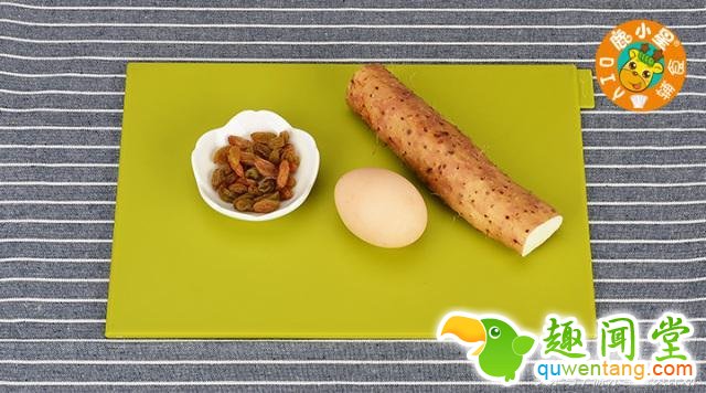 准备1段山药,1个鸡蛋,还有适量葡萄干。