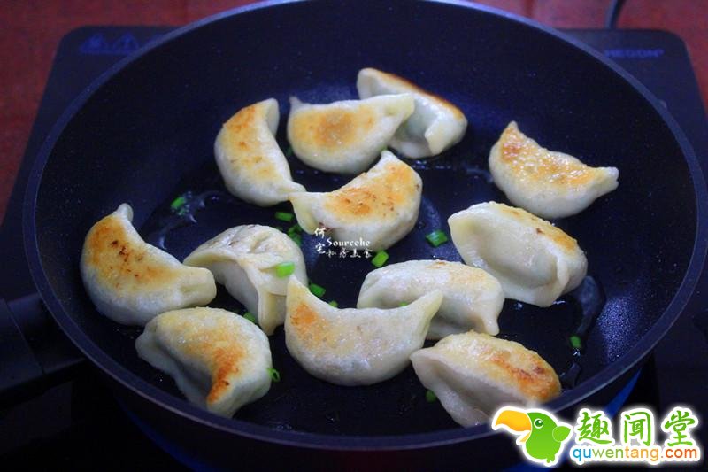 7.饺子可以360度无死角的煎至金灿灿,撒上香葱,即可出锅。