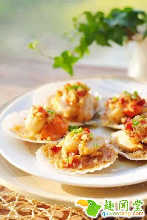 3、将剖出的扇贝肉放在粉丝上,每只均匀的倒入少许黄酒,铺上调好的蒜蓉。
