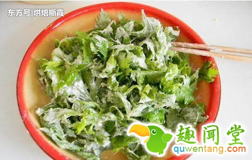 3、准备一个盆子,把芹菜叶子和面粉放进去,搅拌一下。