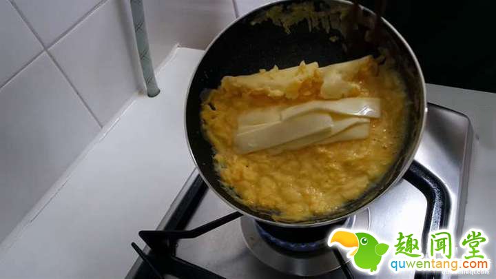 ▼4.在预热后平底锅中薄薄的一层变厚再倒入蛋液。请注意一开始请不断搅拌,熟至图片中的程度时,再把火转小,并放上起司条。