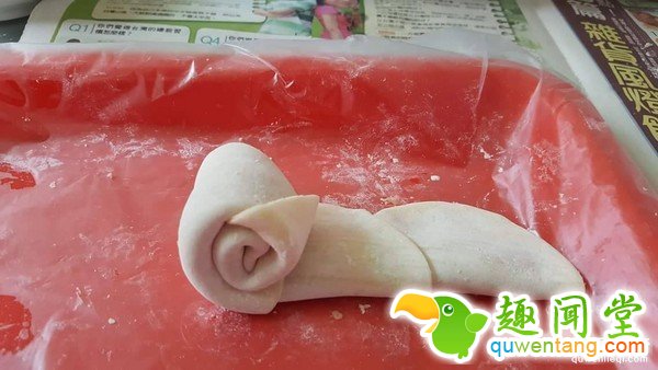 家福吴拍下自己动手做的过程,首先将4张饺子皮铺平,于1/3到1/2处相叠,抹上一层绞肉;接着,将饺皮往上对折,再由左到右卷起,就完成一朵「玫瑰花」了。另外,他也透露,特制的红色酱汁是利用番茄汁加上水、糖及香油调配而成,「面皮吸饱酱汁,好吃得乱七八糟?!?/p>