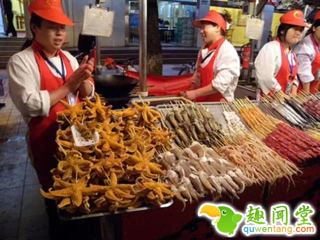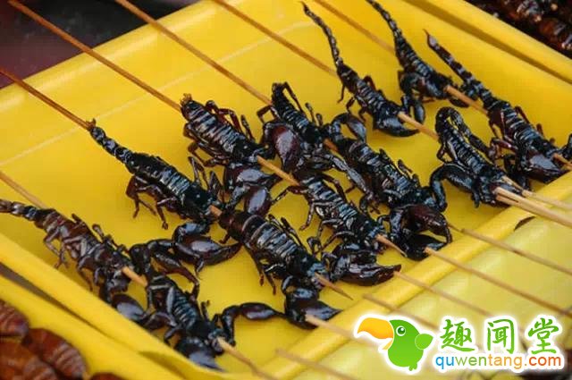 干炸蝎子 据说高温油炸能去除蝎子尾巴上的毒液 而且吃起来松脆可口 像爆米花一样