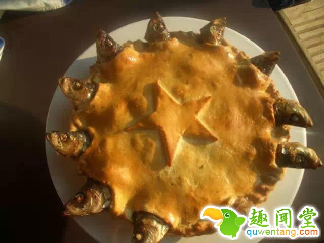 腐国传说中的仰望星空鱼 一群小鱼睁着不能瞑目的双眼,仰望着那湛蓝的星空……创造者本来的意图是在烤派的时候让油能倒流,这样就什么材料都不浪费了。 其实,人家英国人也知道这个是个搞笑餐啦(fun dish),只有一些特殊场合或者逗孩子的时候才弄啦。
