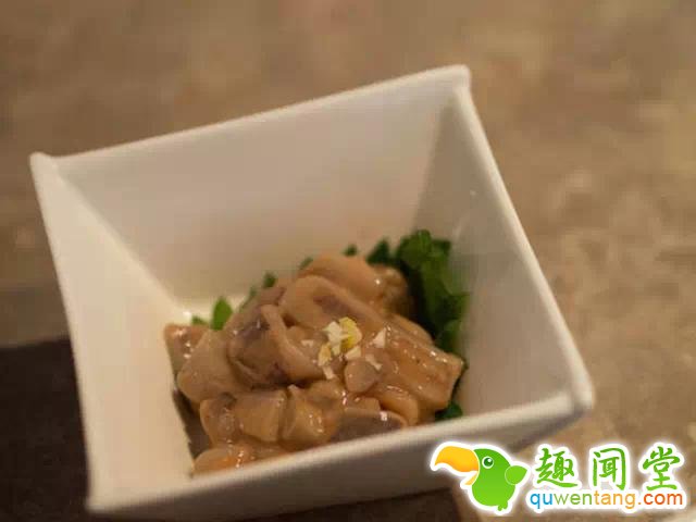 格陵兰岛,冷冻鲸鱼皮和鲸脂切片,腌制或者生吃。(我还以为是西瓜皮,整个人都不好了。