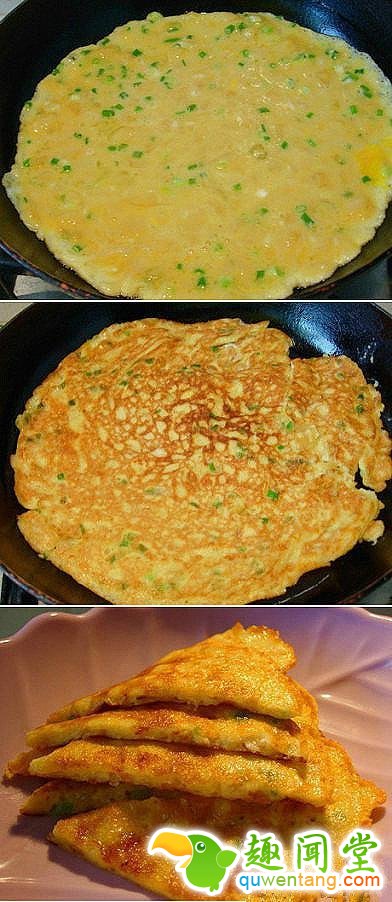 3、平底锅烧热转中小火入蛋液,旋转锅子摊成蛋饼;
