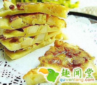 4、将苹果片铺在蛋饼上,待底部熟后再翻转煎,然后装盘。