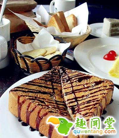 【材料】:白吐司2片,鲜奶200cc,鸡蛋2个,细砂糖1大匙,奶油2大匙,香草精数滴,巧克力酱适量,奶精适量,碎巧克力适量