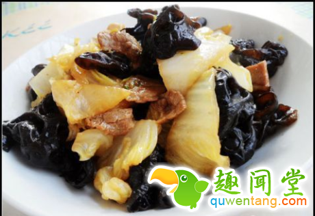 木耳泡好撕成小块,‘白菜帮’(不要绿叶)片成片——如果是块一会就加水焖会,但是不建议这样,片比较好——用盐杀去水分,挤干,腊肠或火腿什么的斜切片,没有不放也无所谓,就是不鲜了。