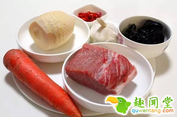 第一步:准备食材。冬笋200克、猪里脊肉300克、水发木耳60克、胡萝卜60克、蒜适量、剁辣椒适量。