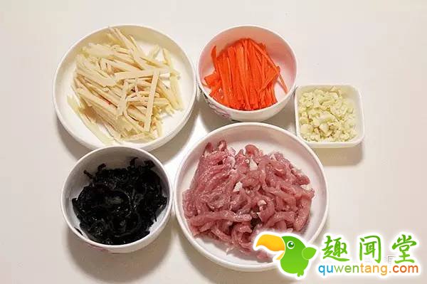 第二步:将猪肉、冬笋、胡萝卜、木耳切丝,蒜切末备用。