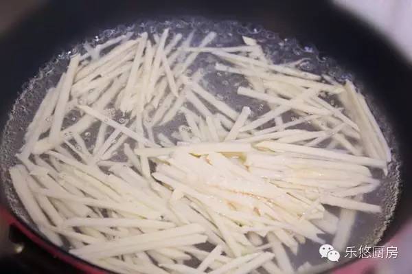第六步:锅中加入适量的油,油热后,将肉丝放入锅中。煸炒至肉丝发白即可盛出备用。