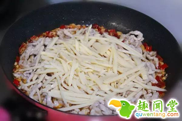 第八步:将肉丝、冬笋依次放入锅中,煸炒匀均。