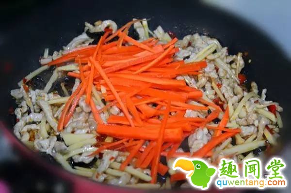 第十步:将胡萝卜丝放入锅中煸炒匀均。