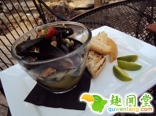 食材:2公斤洗干净的法国贻贝,一定要洗干净,否则会有腥味,6个去皮的西红柿,再配上洋葱,白葡萄酒和新鲜面包,黄油,简直美味极了。