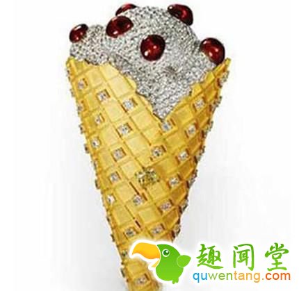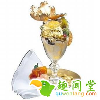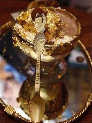 这款由纽约一家餐厅与珠宝商合作推出的超豪巧克力新地堪称世界上最贵的餐后甜点。它混合了来自全世界14个国家的顶级可可,再加上5克可食用的金箔和镶有钻石的金汤匙,可谓金贵无比。