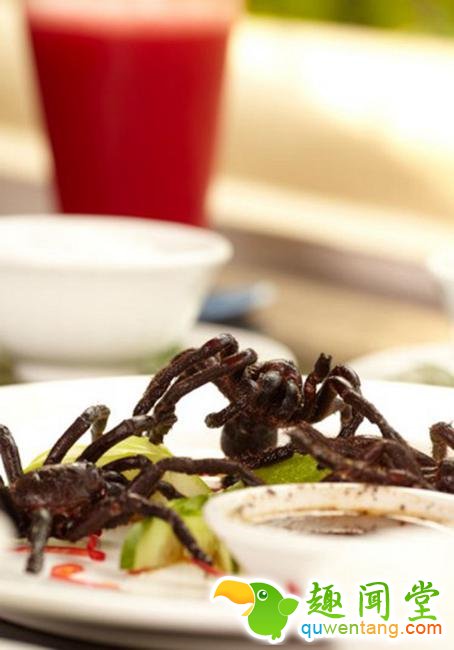 炸蜘蛛是柬埔寨的一道佳肴,要想爱上它需要慢慢培养。这道菜是在名为Phnom Penh餐厅品尝的狼蛛,炸蜘蛛的配料有酸橙和黑胡椒沾酱。据某本书介绍,该餐厅每周供应超过200只蜘蛛。