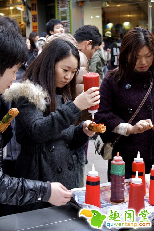 Myeong(明洞)是繁华的购物区,小吃摊林立,种类多样。想吃一般的热狗,您可以买加熏肉、土豆泥和玉米糊的热狗。但这里最具特色的是一种糖葫芦般串在签上的热狗,外面包着酥脆的法式薯条、番茄酱,味道一流,可以唤醒您的味蕾。