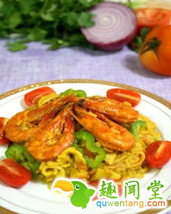 大米100g、大虾6只、蟹肉棒10只、洋葱、青椒各一只、白葡萄酒、葱、咖喱粉、橄榄油、黑胡椒适量