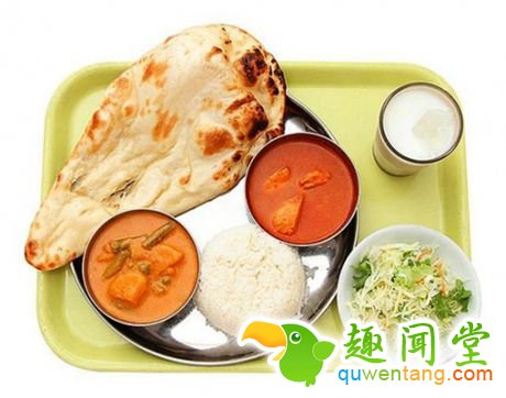 烤饼配咖喱,沙拉and酸奶,印度风,他们家食堂的招牌菜