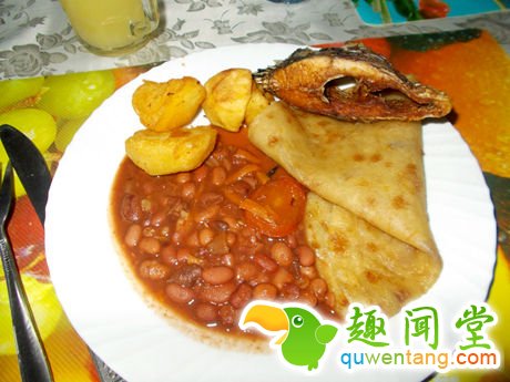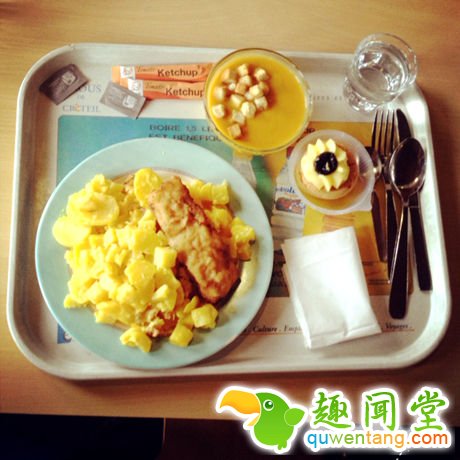 学院料理一直是法国的特色。主食是奶油焗土豆配低温烤鸡,奶油蛋糕盒水果布丁,比某航飞机餐还棒呢。