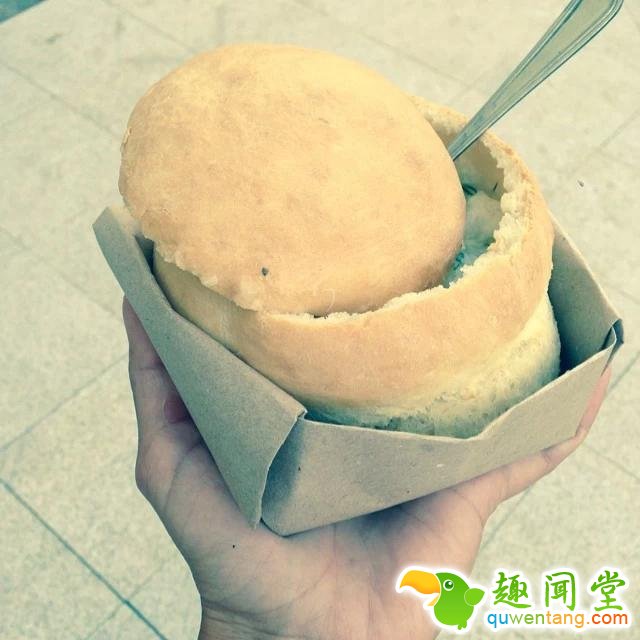 将鸡肉汤装在面包里,据说最好吃的就是沾满汤汁的面包部分