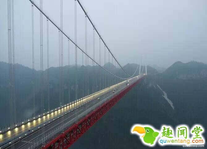 该桥跨越矮寨大峡谷,主跨居世界第三、亚洲第一。