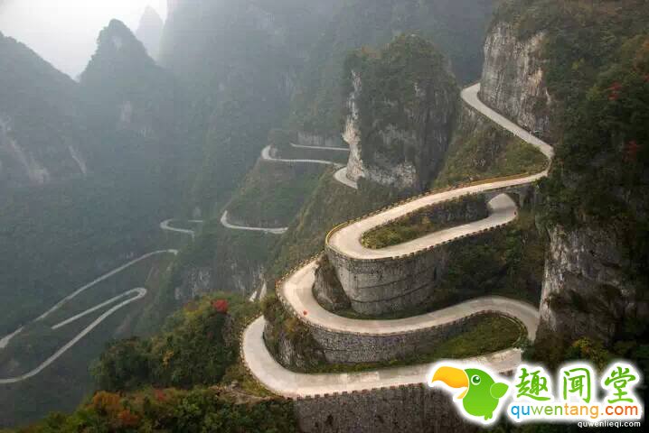 张家界天门山盘山公路有"通天大道"之称,盘山公路全长10.77公里,海拔从200米急剧提升到1300米,大道两侧绝壁千仞,空谷幽深,共计99个弯,180度急弯此消彼长,似玉带环绕,弯弯紧连,层层迭起,被誉为"天下第一公路奇观"。