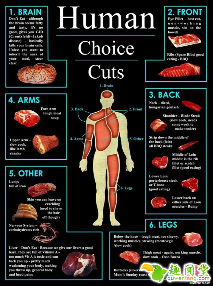 实际上,人肉跟其他动物相比,并不能提供更多热量。根据Cole博士最新一项研究表明,吃掉一整个人大概能摄取12.5万卡路里。当然,如果你能把人啃得更干净,会获取更多热量。