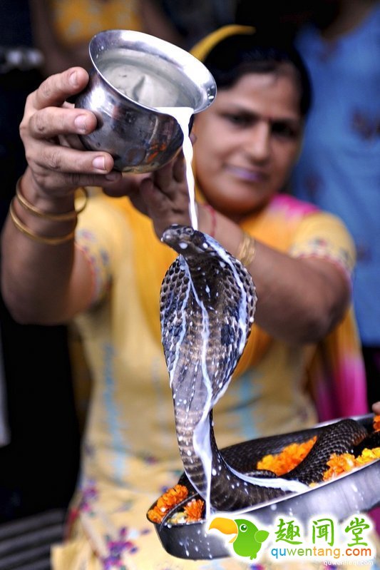 印度蛇节上,妇女们给蛇洗牛奶浴。
