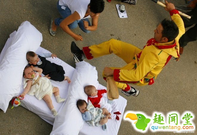 扮演魔鬼的人在婴儿身上跳过,说是这样可以驱除恶灵,这个圣体节太迷信了。