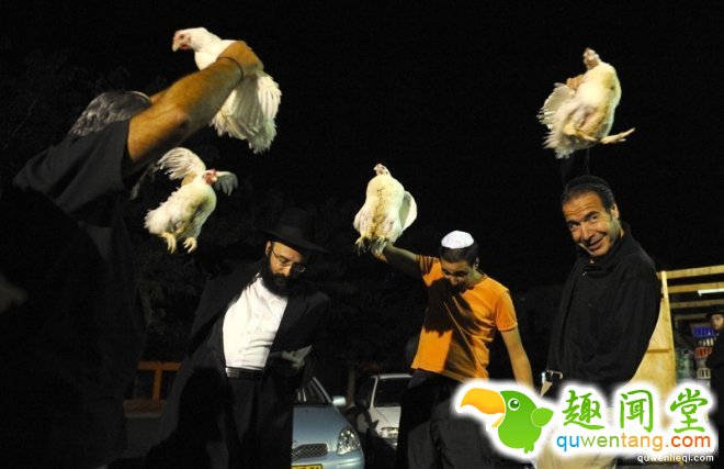 犹太的男人们提着鸡在自己头顶晃荡,据说是为了转移厄运到鸡身上,让自己获得福气。