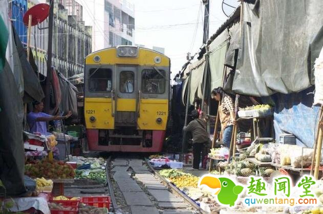 美工铁道市场与泰国其他市场最大的分别,就是市场中央有一条贯穿市场的铁道。商家们在火车快到达时将货物搬到一旁,待火车以时速15KM的速度经过之后又重新摆摊。