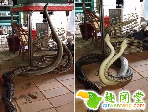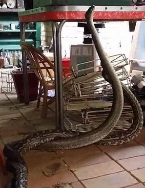 在描述这个场景时,他补充道:“周日,我从农棚里出来时,看到了厨房里的蛇尾。随之,那条蛇快速躲到桌子下,消失在视线中。当我走近一看,它已经和另外一条蟒蛇纠缠在一起,开始了战斗。我敢确定,它们一定是为了赢得附近一条母蛇的欢心而打架。”