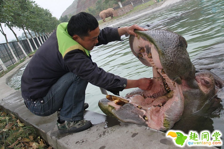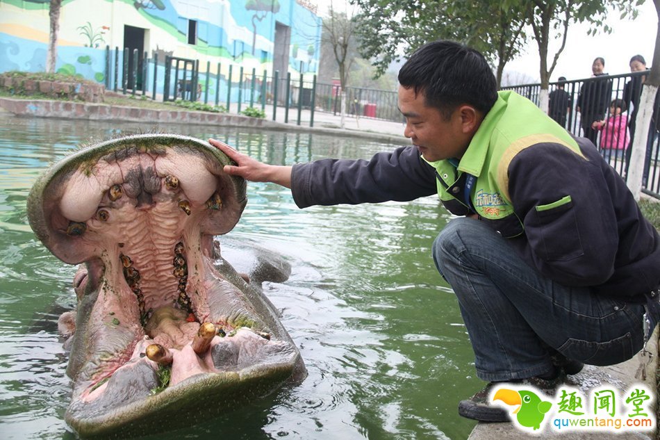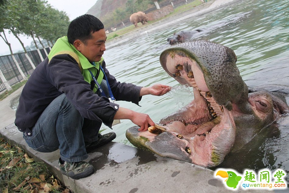 重庆动物园一河马进食后卡牙 主动求饲养员剔牙