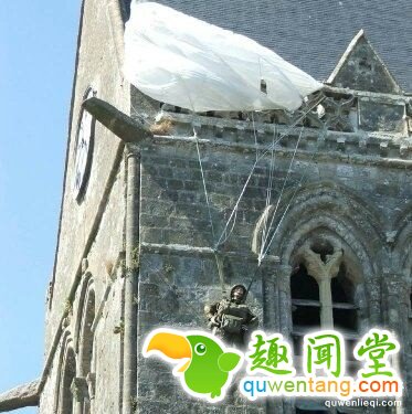上面有讲到一位卡在教堂上的伞兵,其实他是第505师伞兵团的约翰(John Steele),当天是D-DAY,地点在圣梅尔埃格利斯,现在那边的教堂还有放着他的模型和一个挂在教堂上的降落伞。