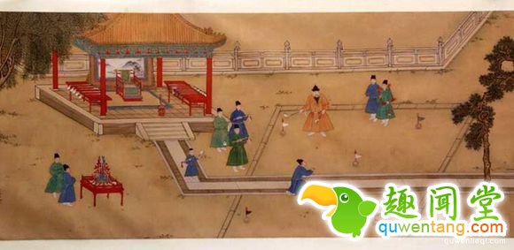明宣宗行乐图。图中拿根小棍瞄准地上一枚弹子者为明宣宗。你猜他在干啥?打高尔夫。真的,这项运动古代叫捶丸,拿小棍捶石球之意也。最早起源于宋代,元代时期大受上流社会欢迎,在明代成为流行运动。是一种无论男女,老少咸宜的休闲娱乐方式。