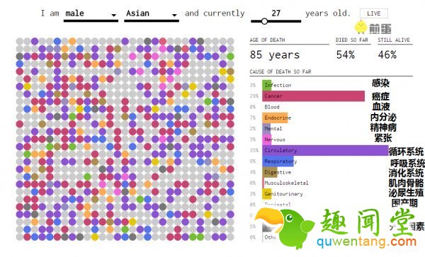 输入你自己的年龄、性别和种族后先别急着离开。调整参数,查看结果的变化也很有意思。不知道你发现没有,如果你越年轻,你就越不可能死(废话…)。好吧,这条不算新鲜,但是看着自己随着年龄增长,死法一年换一个花样也是蛮魔性的。比如说,假如你在20岁前死了,你最可能死于围产期,先天疾病或者外部原因。假如你在50多岁挂了,最可能的死因就是癌症或者心脏疾病。